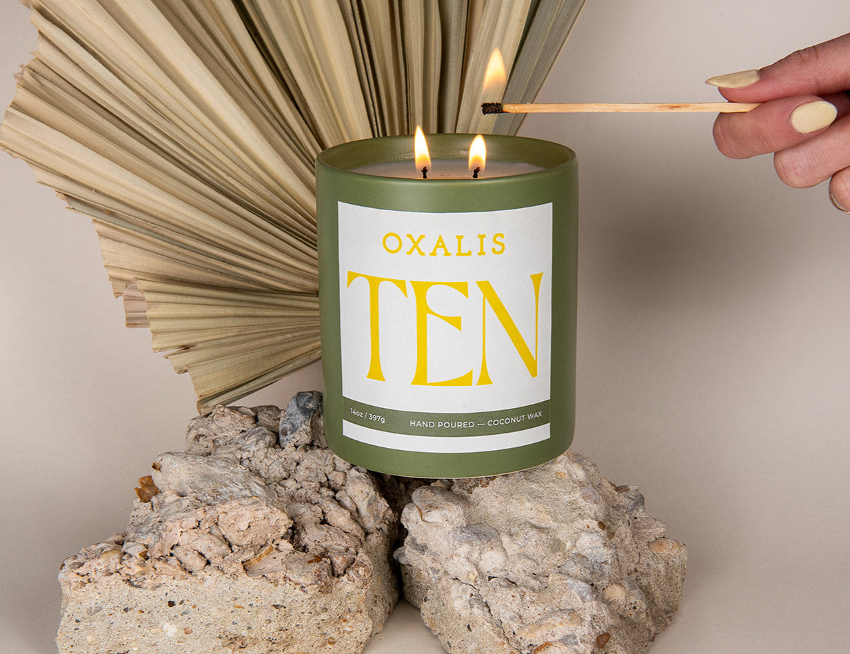 TEN is a tribute to the delicate balance of nature and nostalgia, celebrating ten luminous years of Oxalis. Created in collaboration with Hazeltine, TEN envelops you in an intoxicating floral haze of star jasmine, sun-soaked herbs, bright citrus, and the sweet, spicy warmth of pink peppercorn and tonka bean. A fragrant love letter to humid summer days—burn with friends, old and new.